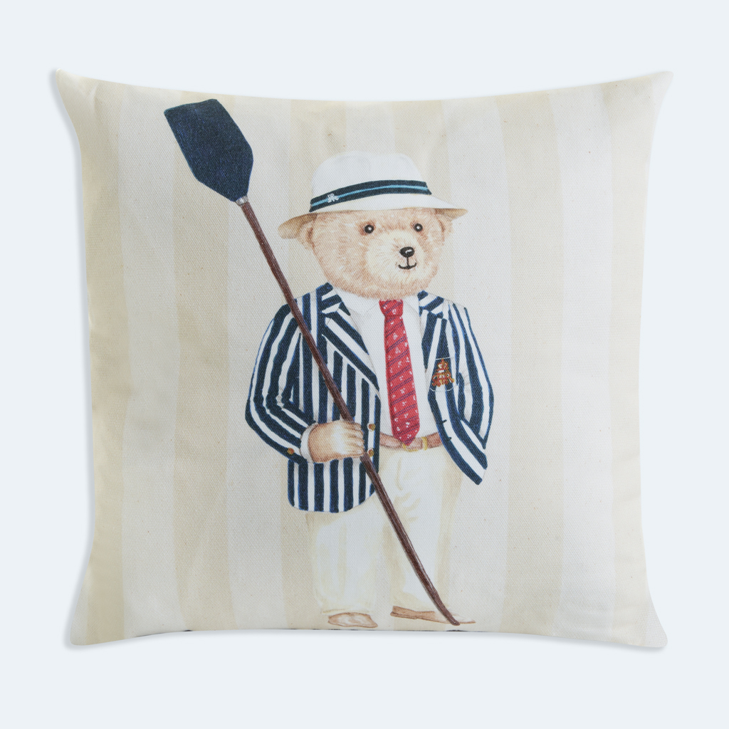 Exclusive drawing by Emma Taylor of our HRR bear on a range of complementary products. Light beige stripy cushion featuring the HRR bear on one side and “Henley Royal Regatta” on the reverse.