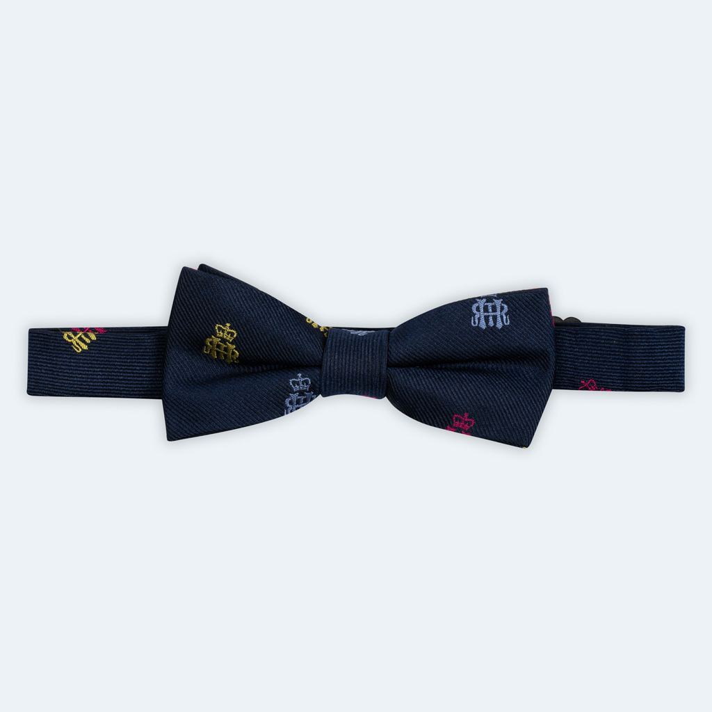 Navy tie with colourful HRR logos in a pattern creating a tie that can be worn on any occassion.